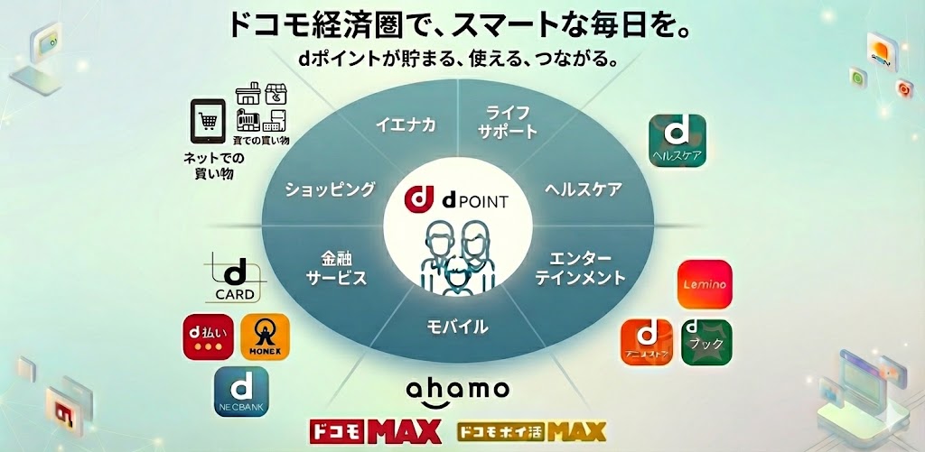 ドコモ経済圏では、日常のスマホ代・買い物・投資まで、あらゆる場面でdポイントがたまる仕組みが整っています。