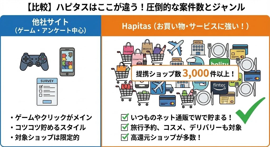 ハピタスは、他のポイントサイトと比べても「お買い物への強さ」が際立っています。ゲームなどのコンテンツをあえて絞り、還元率を高めている点が特徴です。自分に合うサイトか見極めるために、具体的な違いを見ていきましょう。