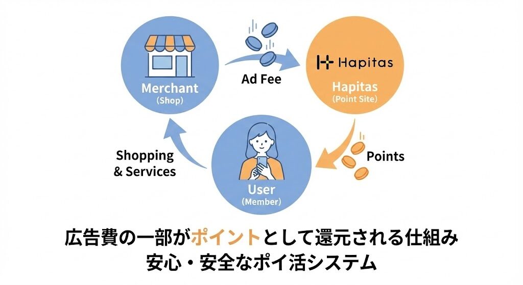 ハピタスでポイントがもらえるのは、企業からの広告費をユーザーに還元しているからです。怪しい仕組みではなく、テレビCMなどと同じ広告ビジネスの一環です。まずはその透明性の高い仕組みを確認しましょう。