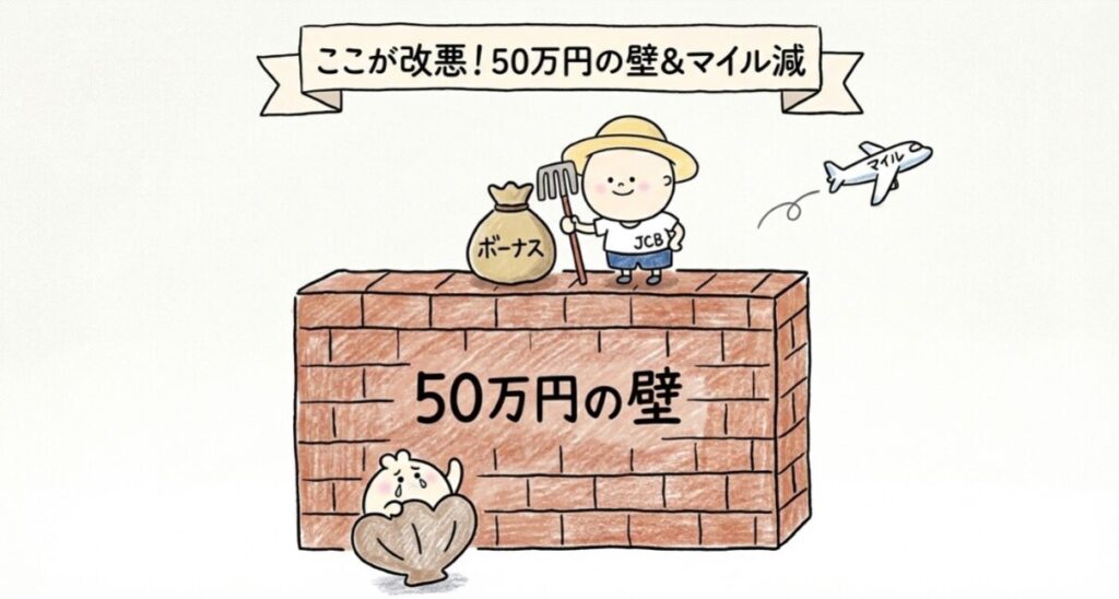 💡重要な補足:後述する「JCBカードW」はJ-POINTボーナスの対象外であり、代わりに常時ポイント2倍(還元率1.0%)が適用されます。つまりJCBカードWに切り替えれば、「50万円の壁」問題はそもそも発生しません。 「改悪」が気になる方こそ、記事後半のJCBカードWへの切り替え戦略をぜひご確認ください。