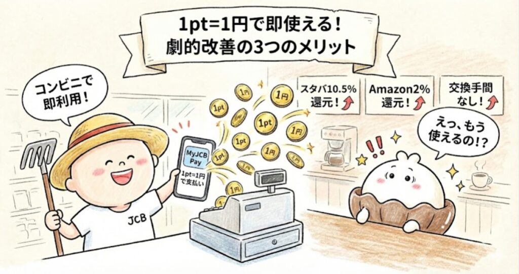・改善ポイント:1pt=1円の明確さ、MyJCB Pay、高還元率パートナー店、300万円超は実は旧制度より有利