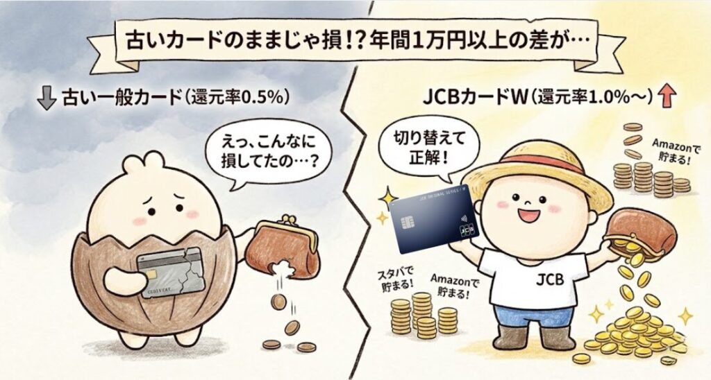 旧来のJCB一般カード(還元率0.5%)を使い続けるのは、J-POINT時代において最も避けるべき選択です。