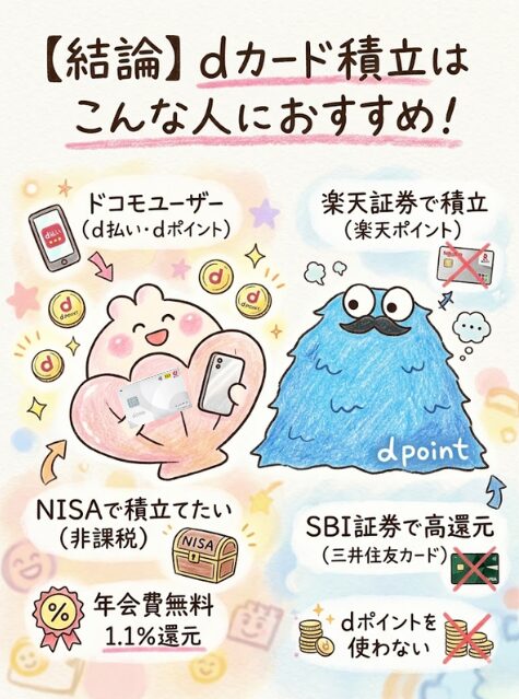 まだクレカ積立を始めていない人にとって、dカード積立はシンプルで始めやすく、且つポイント還元率も高い優れた選択肢です。