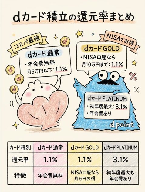 dカード通常は年会費永年無料で、積立還元率は月5万円以下で1.1%、5万超〜7万円で0.6%、7万超〜10万円で0.2%です。