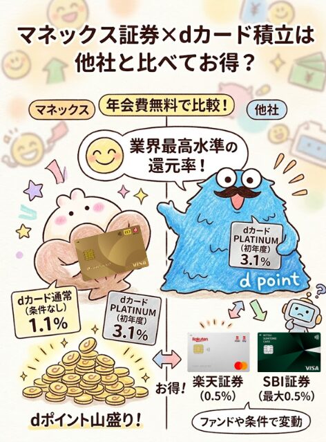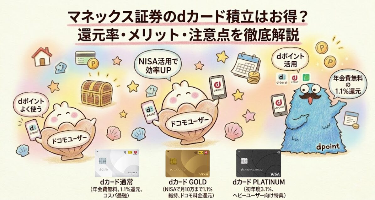 また、2026年10月以降のマネックスカード改悪(月ショッピング1万円未満で積立還元率0%)を踏まえると、マネックス証券でクレカ積立するならdカードが事実上の選択肢となっています。
