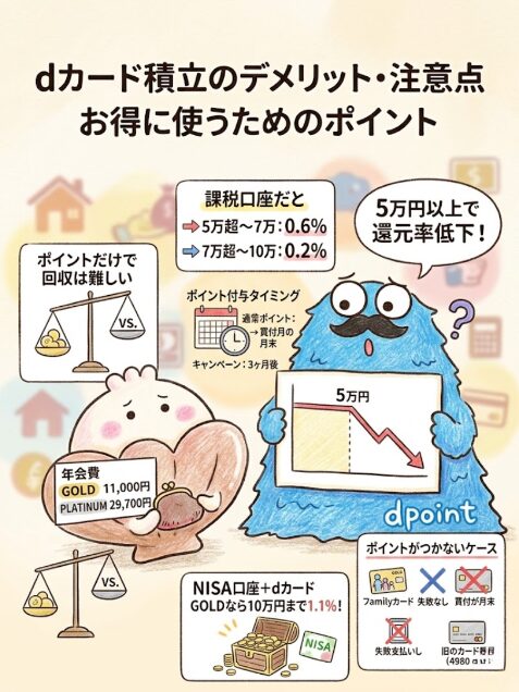 つまり、同じdカード GOLDでも、NISA口座で月10万円積立すれば13,200P/年が貯まるのに対し、課税口座では月10万円でも8,760P/年にとどまります。NISA口座の方が年間4,440ポイント多く貯まる計算です。