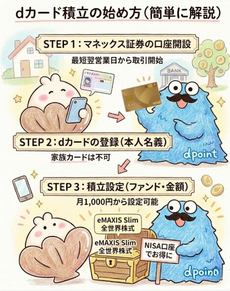 実際にdカード積立を始めるための手順を3ステップで説明します。
