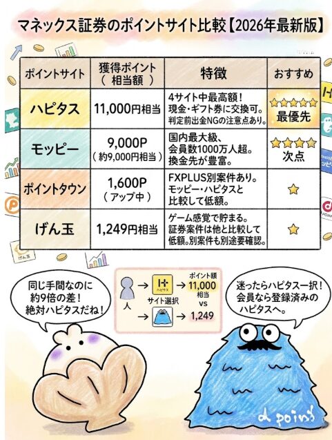 2026年3月時点のマネックス証券ポイントサイト比較では、ハピタスが11,000円相当で最も高く、次いでモッピーの9,000円相当という結果です。