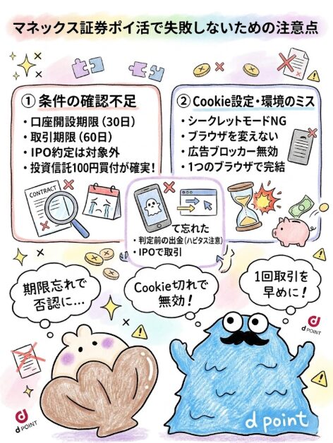 主な否認ケースは次のとおりです。申込から30日以内に口座開設が完了しなかった場合、60日以内に取引しなかった場合、IPO約定など対象外取引で条件を達成しようとした場合、申込途中でブラウザを変えた場合、判定前に口座から全額出金した場合(ハピタス公式記載)、シークレットモードで申し込んだ場合などが挙げられます。