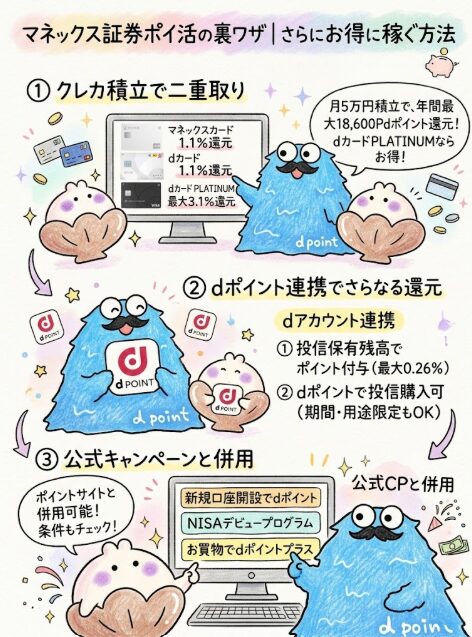 - さらにお得にするなら:クレカ積立(マネックスカード1.1%・dカードPLATINUM最大3.1%)+dポイント連携