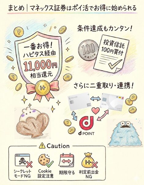 - ハピタス経由のポイ活(11,000円)+dカードPLATINUM積立(年間18,600円)の合算:口座開設1年目の合計 = 約29,600円相当