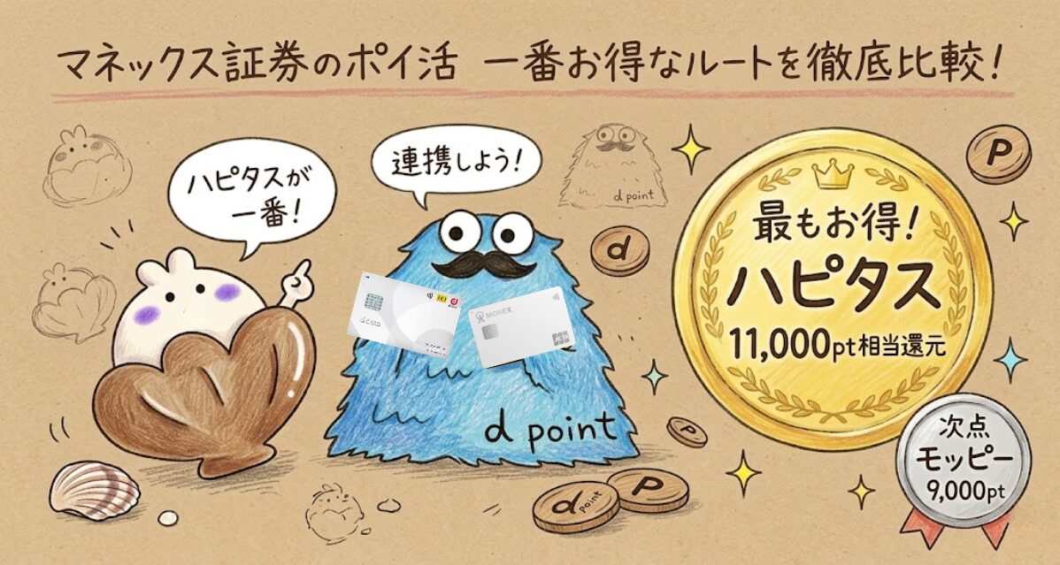 2026年3月時点で、マネックス証券のポイ活はハピタス経由が最もお得です。