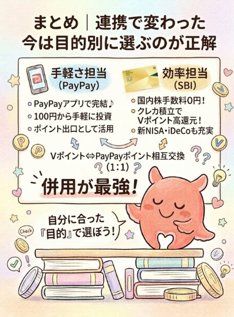 2026年現在、PayPay証券とSBI証券は「どちらが上か」ではなく、「目的に応じて使い分けるもの」という関係になっています。