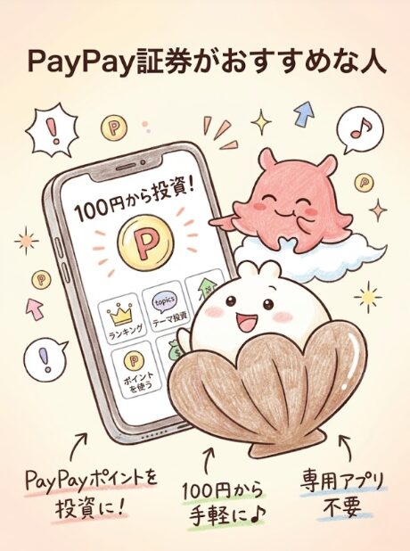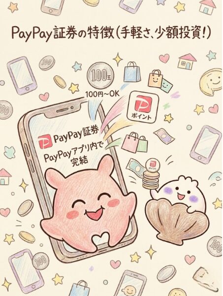 • PayPay証券:PayPayアプリの中だけで投資が完結、100円から始められる手軽さ(PayPay銀行連携時)、PayPayポイントをそのまま株や投資信託に使える