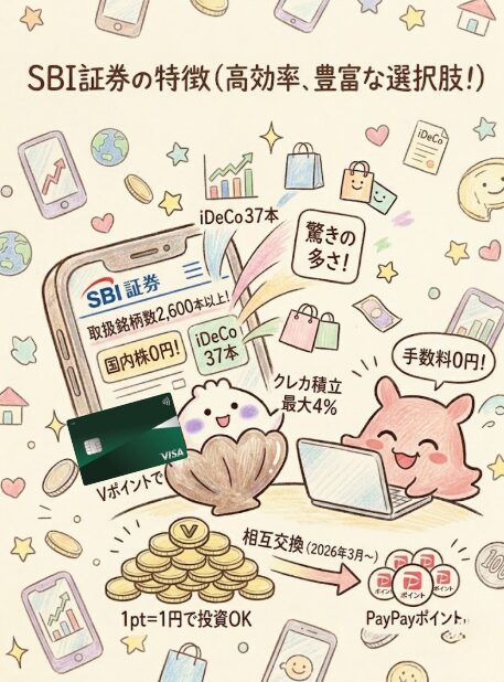 • SBI証券:国内株の売買手数料が0円(インターネットコース+電子交付の条件あり)、三井住友カードのクレカ積立でVポイントが最大4%貯まる、VポイントはSBI証券内でそのまま投資に使える(1ポイント=1円)