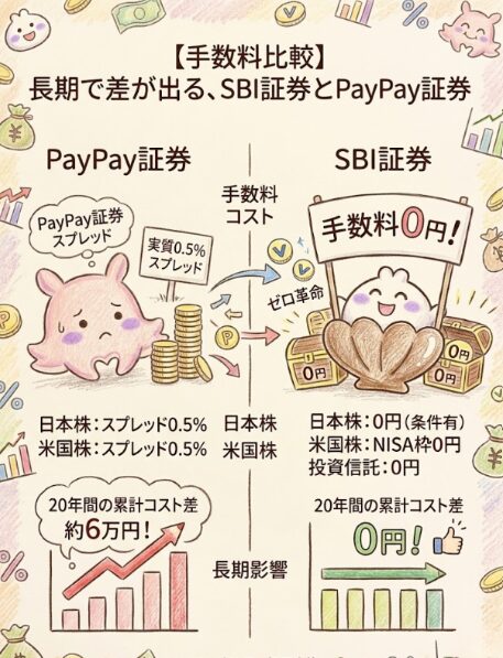 A. 国内株(個別株)の手数料差が最も大きいです。PayPay証券はスプレッド0.5%(立会時間内)、SBI証券はインターネットコース+電子交付の条件を満たしていれば0円です。月5万円の日本株を20年間積み立てた場合、購入時のスプレッドだけで約6万円の差が生じます(売却時はさらに差が広がります)。なお、投資信託の買付手数料は両社とも0円です。