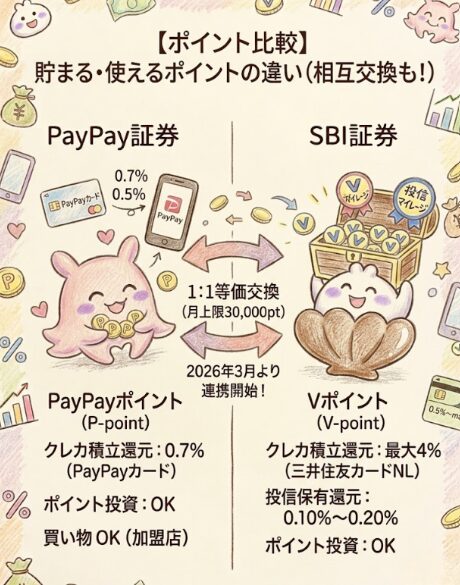 • 連携の変化:2026年3月24日からVポイントとPayPayポイントが1:1で相互交換可能になり、SBI証券で貯めたVポイントをPayPayポイントに変換して日常生活でも使えるようになった