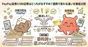 結論から言うと、2026年現在は「SBI証券が投資効率で有利、PayPay証券が手軽さで有利」という構図が固まっています。実際に両方を使ってみると、それぞれ得意なことがはっきり違います。