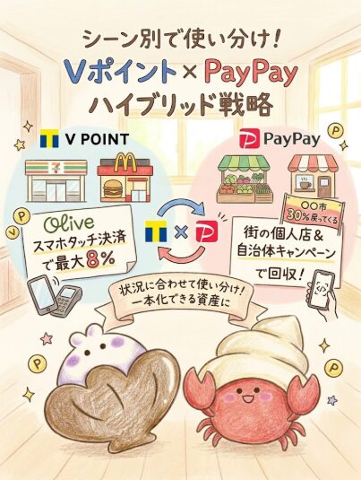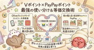 コンビニ・大手飲食では「Oliveスマホタッチ決済」で8%のVポイントを稼ぎ、Visa非加盟の個人店や自治体キャンペーン時は「PayPay」で稼ぐ。両方で稼いだポイントを、1:1交換で行き来させながら「最も価値が高い使い道」に集約させる。これが2026年の最強ポイント戦略です。