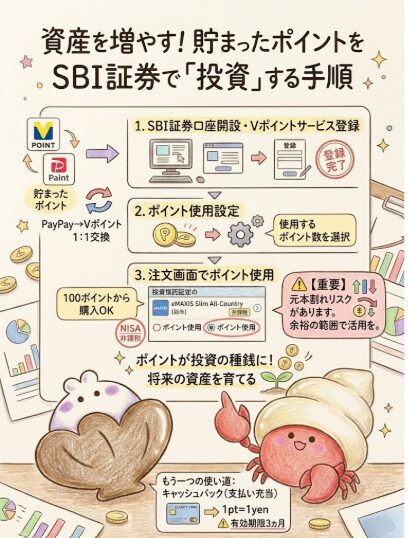 PayPayポイントはSBI証券では使えないが、Vポイントに交換すれば100ポイントから投資信託・国内株式の購入に充てられる。元本割れリスクに注意。